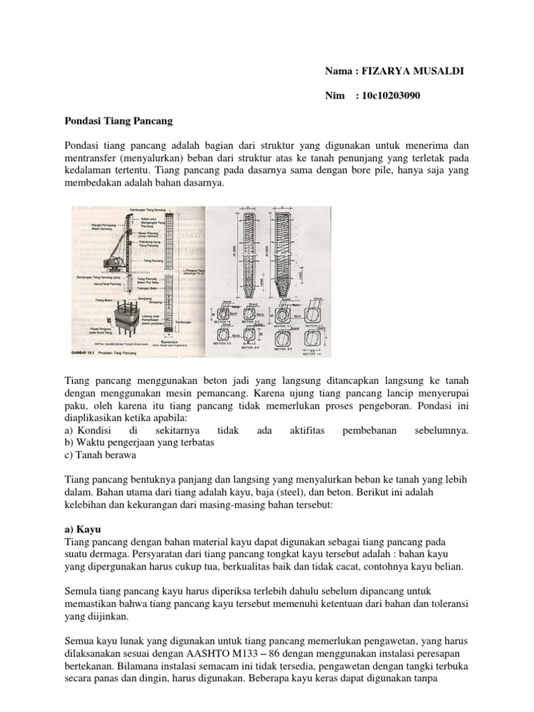 Bahan tiang δ = ϕ 'd baja 200 beton 0.75ϕ ' kayu 0.66ϕ ' contoh soal: Tiang pancang sebagai pondasinya yang utama disebut juga sebagai reinforced concrete pile, yaitu material beton bertulang. Anchorage to pedestal design based on aci 318 14 aisc pondasi strauss pile sumber : Pondasi tiang digunakan bila tanah pondasi pada kedalaman yang normal tidak mampu mendukung bebannya dan tanah kerasnya terletak pada kedalaman penggunaan baja atau profil h atau pipa lebih baik digunakan dari pada beton.tetapi penggunaan tiang baja harus diperhatikan ph air yang. D deeww contoh laporan tugas teknik rekayasa pondasi sumber :